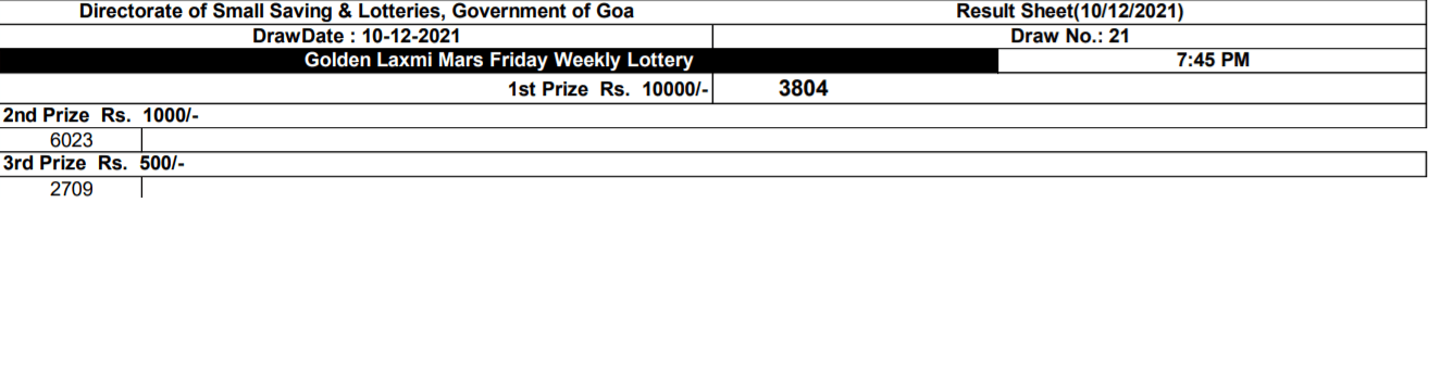 Goa Golden Laxmi Mercury Saturday Weekly Lottery Results 11 December 2021: Government of Goa Department Of Finance Issued the Notification Of Goa State Golden Laxmi Mercury Lottery. The Price of the Lottery Ticket is Only Ten Rupees. So this Reason Candidates Have a Chance to Buy Goa Lottery Tickets and Win Lots of Prizes. Every Saturday Around 7.45 PM this Results Will be Out On Its Official Web Portal. If You Have a Lottery Ticket of Goa, Download Winner Sheet through the Official Website Or By the Below Given Links. This Goa Golden Laxmi Mercury Lottery Winner Sheet Will be Show All Prize Winners Lottery Ticket Numbers (1, 2, 3,4th Prizes). Candidates Stay Connect With this Page to Download and View the Goa Golden Laxmi Mercury Lottery Result.