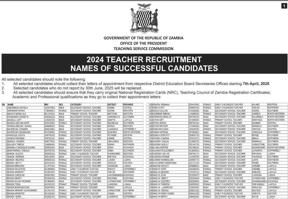 2025 Teacher Recruitment List Zambia Download Pdf